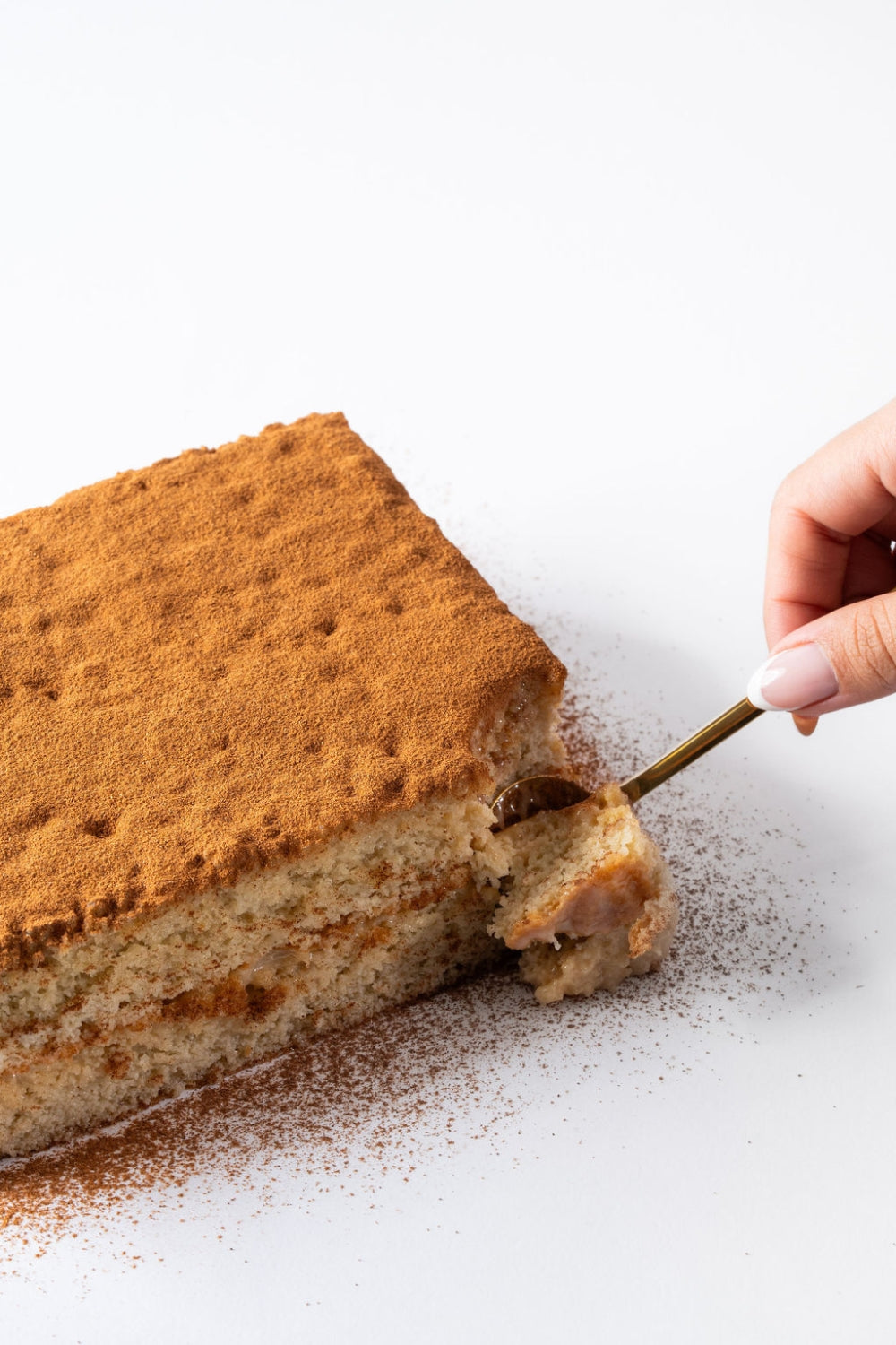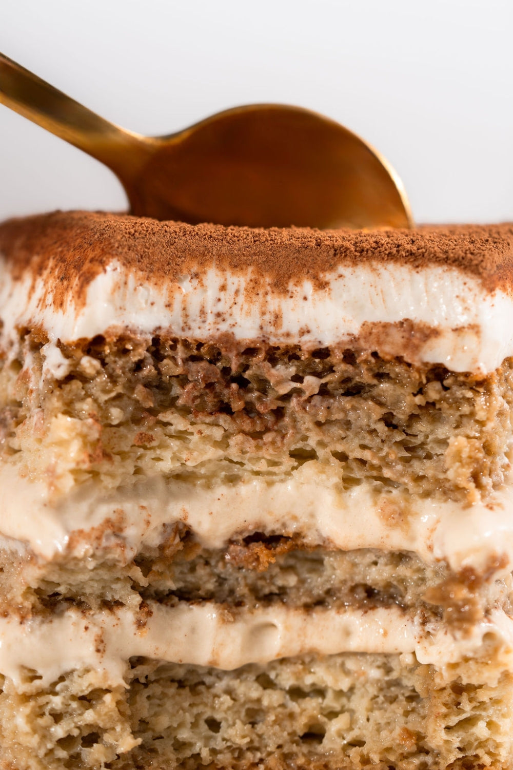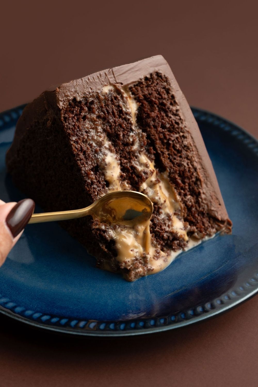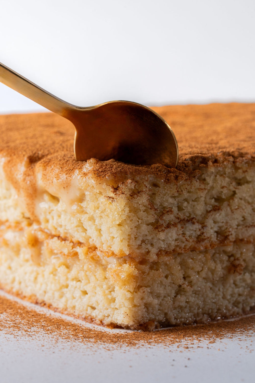 Una cuchara sujeta un pedazo de torta tres leches de chocolate.