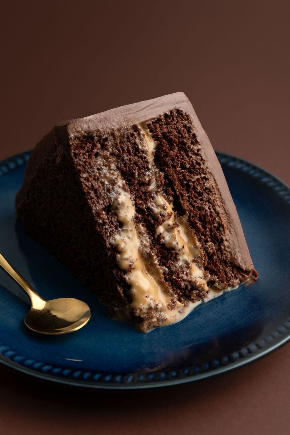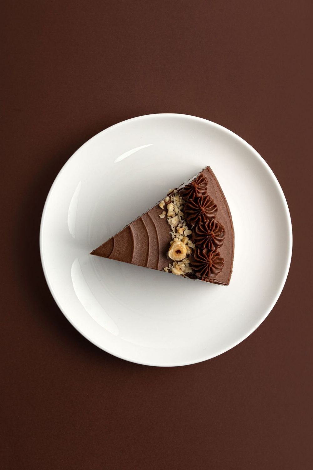 Un trozo de torta de chocolate sobre un plato.