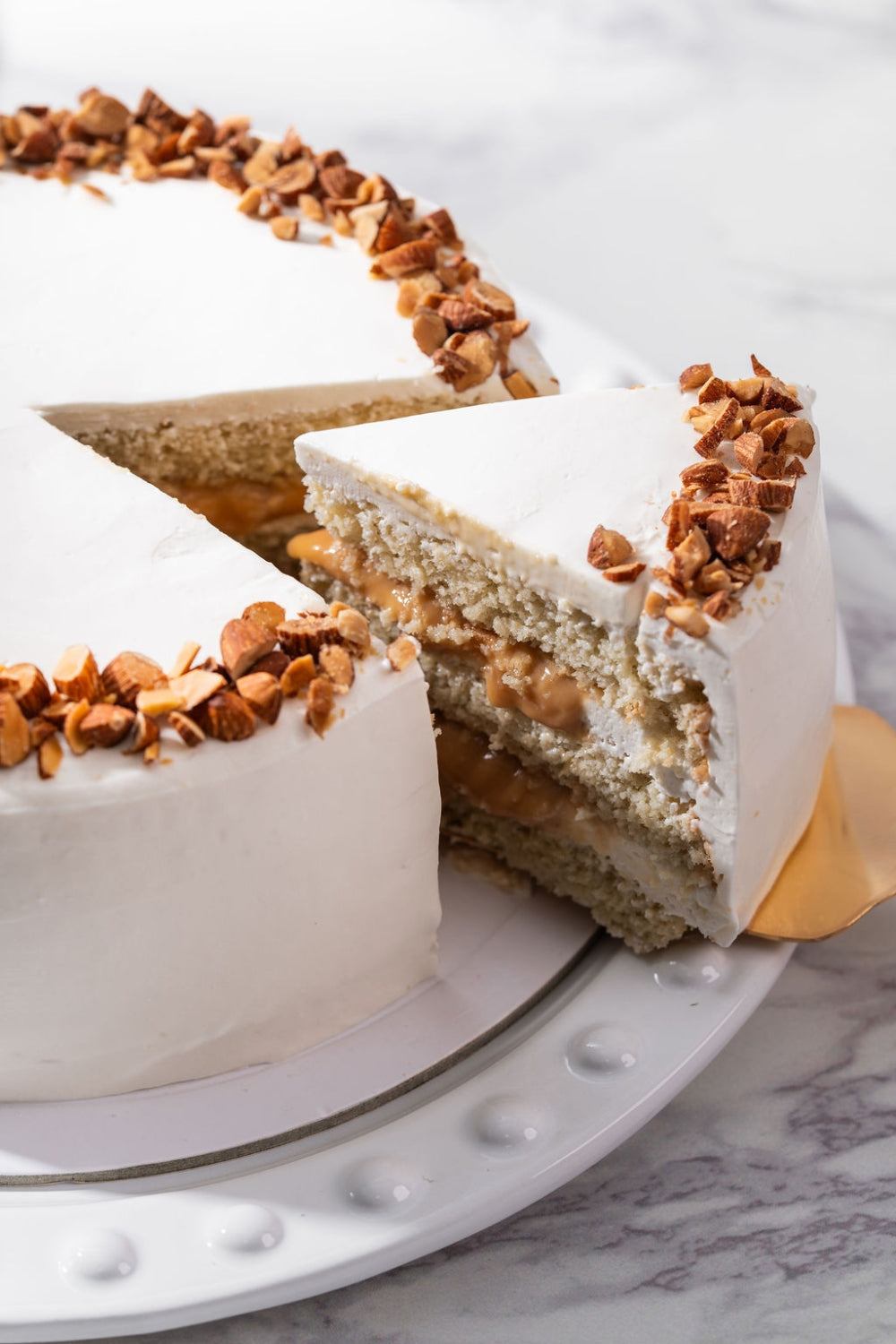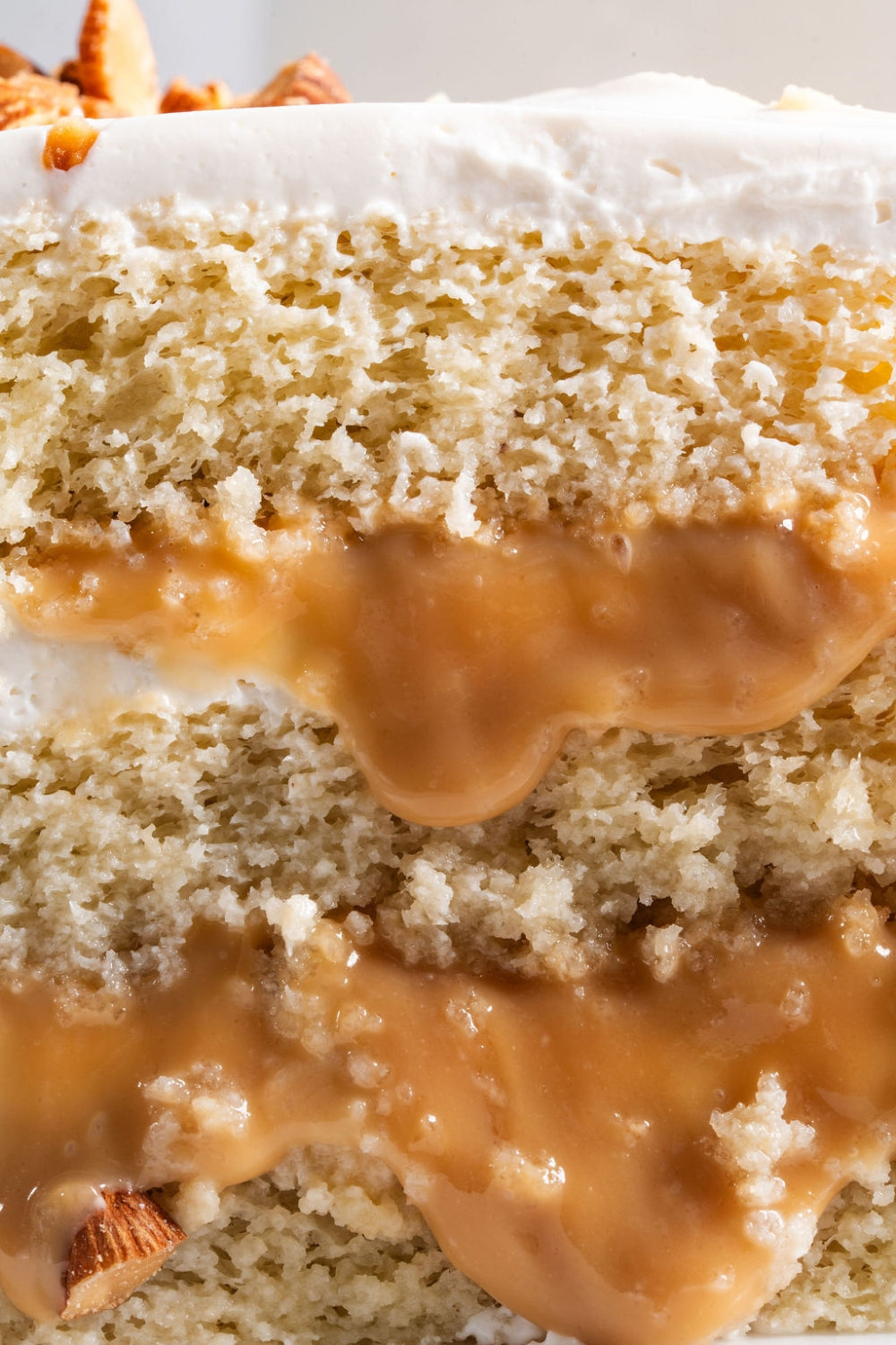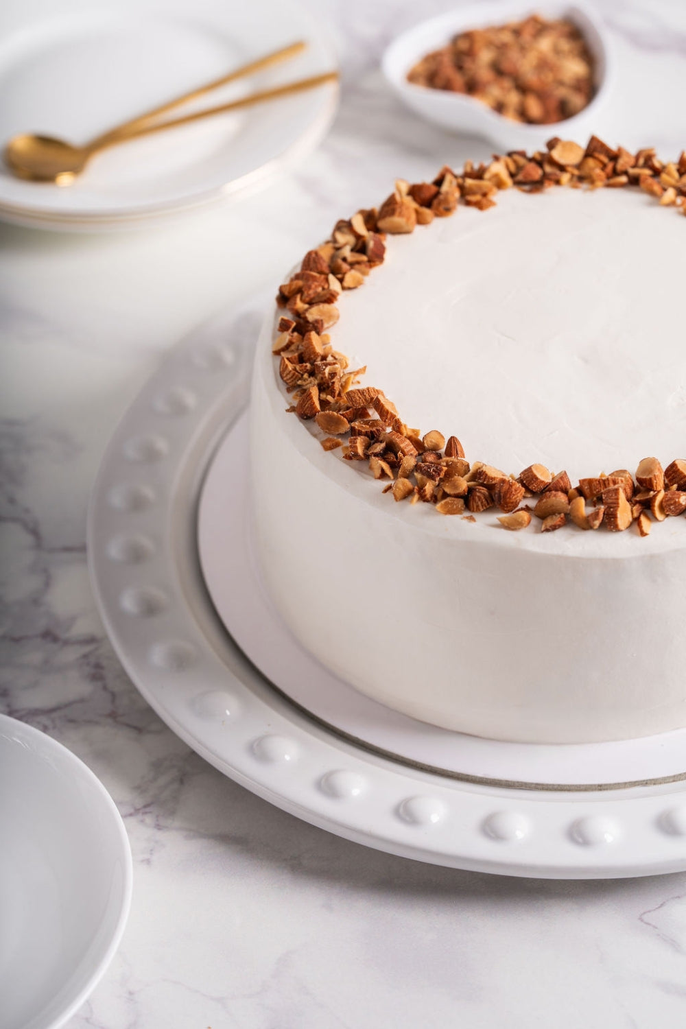 Harina de almendras, huevos, leche de coco, allulosa y monk fruit. Relleno de un manjar de olla keto, bañado con un frosting de queso crema.